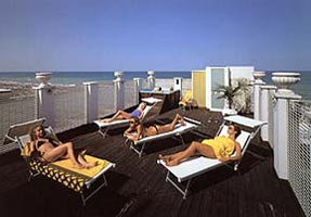 Set on the sea front, in the most exclusive part of Riccione, only a very short distance from the famous Viale Ceccarini, the Promenade e Residence Thermae hotel offers traditional hospitality, friendly service, comfort, thermal spa with health and beauty treatments, and creative cuisine served in a refined elegant setting. Its public rooms furnished in pink marble and precious old furniture offer a relaxing atmosphere of pleasure and beauty. The hotel features 42 entirely air-conditioned and elegantly furnished rooms equipped with a private bathroom, satellite TV, hairdryer, electronic safe, mini-bar, direct dial telephone, and magnificent balcony with view of Riccione's calm Adriatic sea.